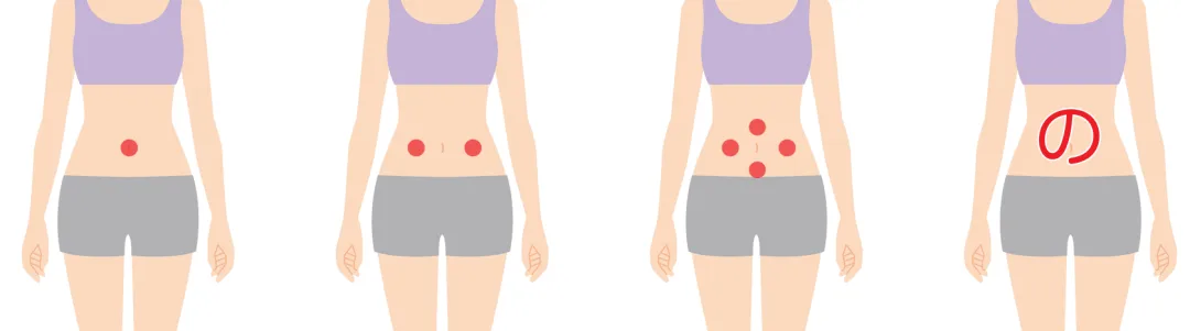 お腹が冷えやすい人、便通が良くない人、みぞおちのあたりが張りやすい人など球頭部分をおへそとその周囲2〜4箇所に置くか、『の』の字にゆっくりと軽い力で押さえていくと良いです。
